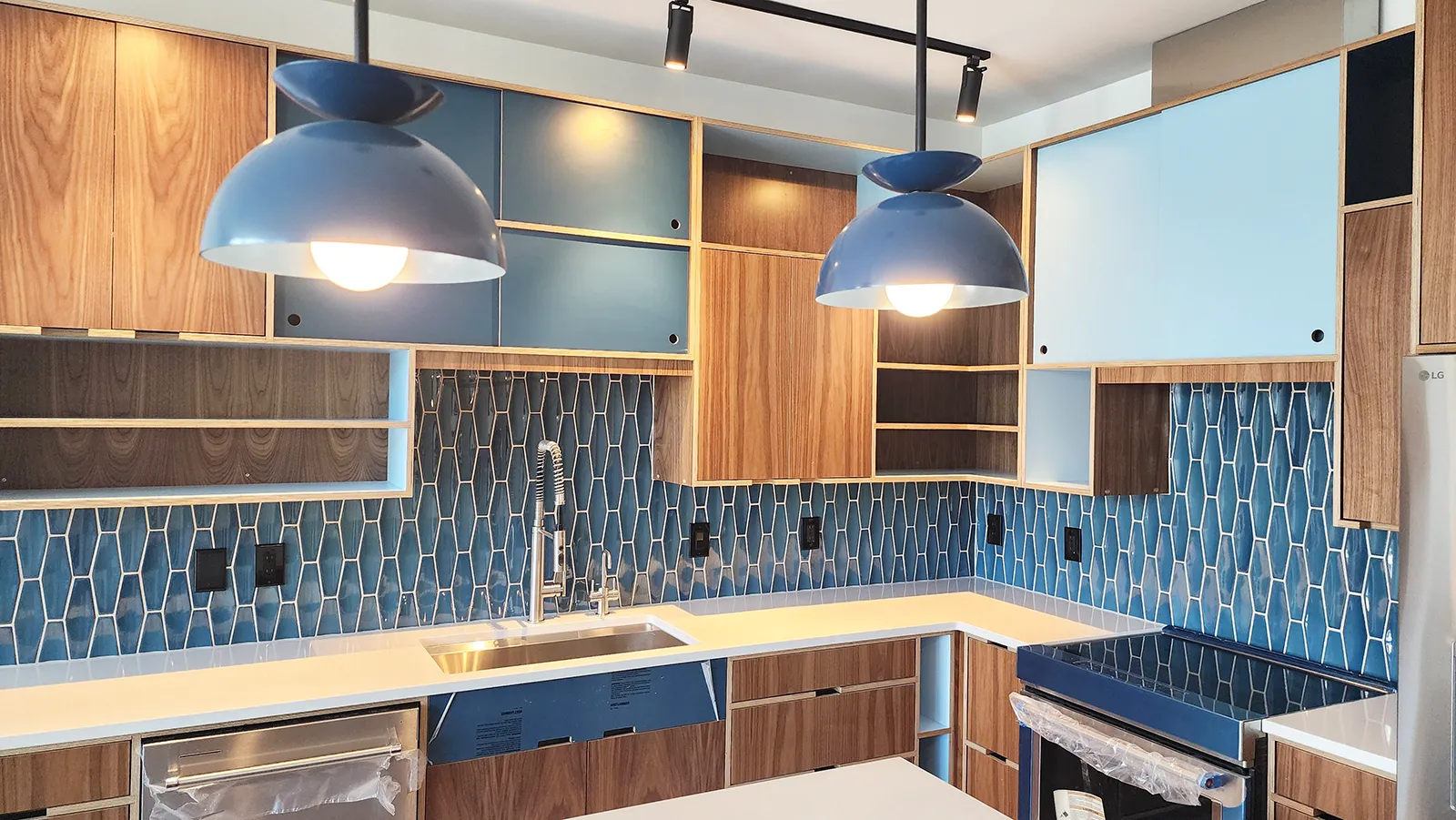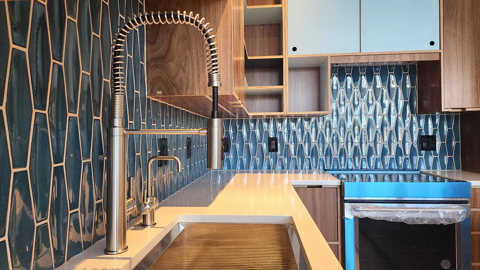 Backsplash: Glossy, hand-laid geometric tile in layered shades of blue, adding a bold visual texture and tying together the room’s color palette.