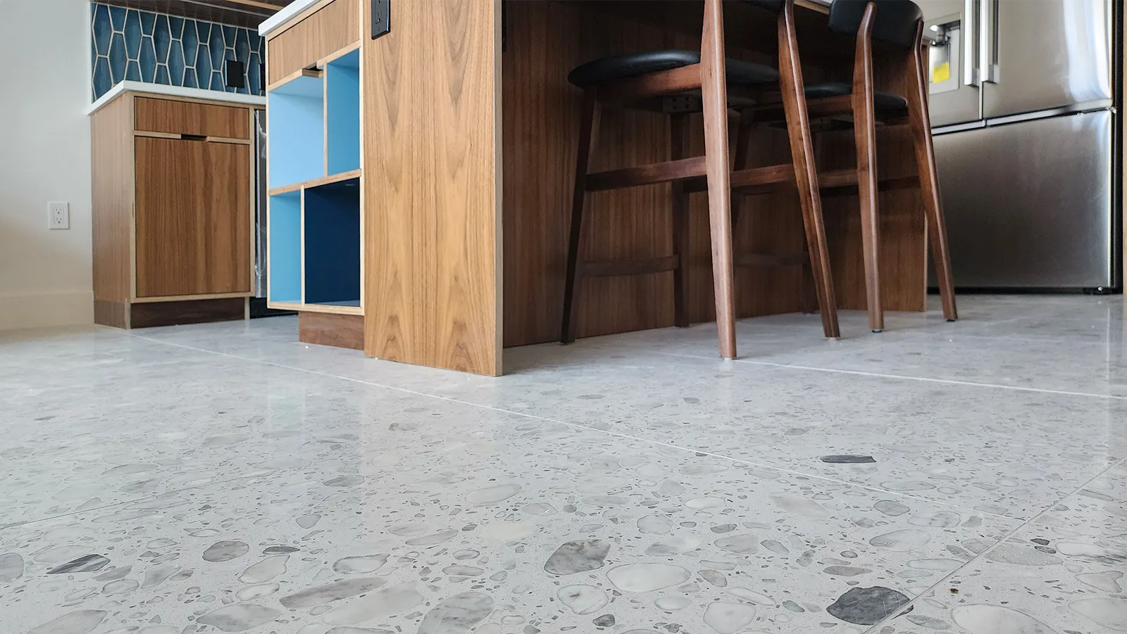 Flooring: Large-format terrazzo-style porcelain tiles deliver a polished, retro-contemporary finish that’s both durable and timeless.
