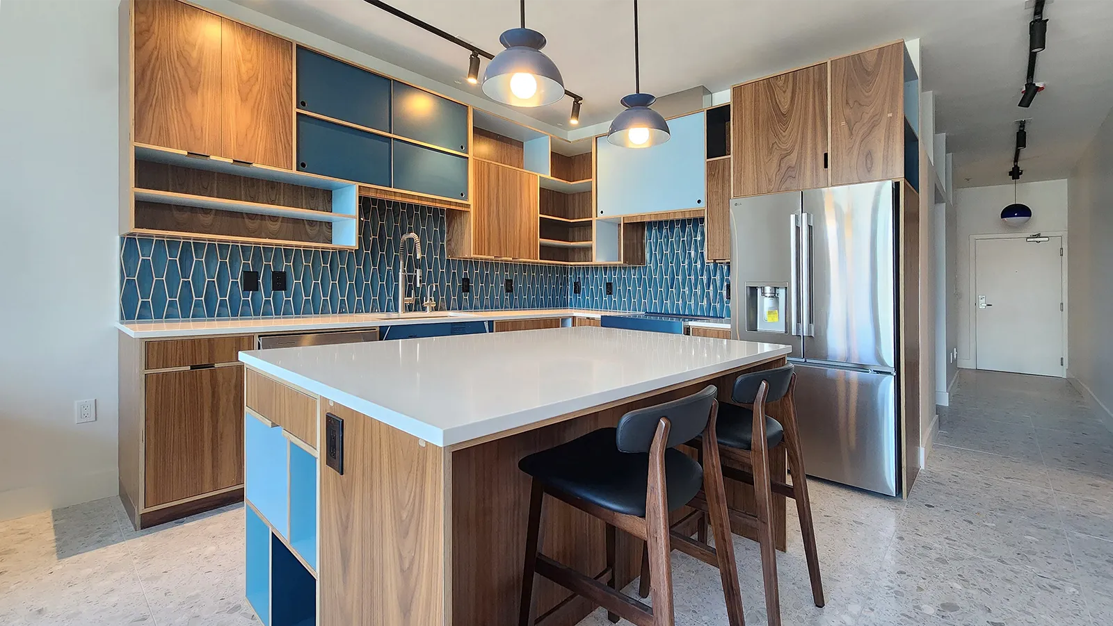 Cabinetry: Custom flat-panel cabinets crafted from walnut veneer with a mix of open shelving and sliding panels in contrasting navy, sky blue, and white laminate finishes.
